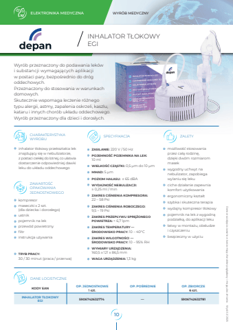 ELEKTRONIKA MEDYCZNA WYR%u00d3B MEDYCZNYHELBO sp. z o.o. ul. Tadeusza %u015aliwiaka 14A 30-797 Krak%u00f3w KODY EAN OP. JEDNOSTKOWE 1 szt. OP. PO%u015aREDNIE OP. ZBIORCZE6 szt.INHALATOR T%u0141OKOWYEGI 5906742632774 %u2015 5906742632781DANE LOGISTYCZNEINHALATOR T%u0141OKOWYEGICHARAK ZALETY TERYSTYKAWYROBUSPECYFIKACJAZAWARTO%u015a%u0106OPAKOWANIAJEDNOSTKOWEGOkompresormaseczki x 2 szt.(dla dziecka i doros%u0142ego)ustnikpojemnik na lekprzew%u00f3d powietrznyfiltrinstrukcja u%u017cywaniaDane oraz zdj%u0119cia zawarte w karcie maj%u0105 charakter pogl%u0105dowy i mog%u0105 ulec zmianie. Wyd. 02/ 2025mo%u017cliwo%u015b%u0107 stosowania przez ca%u0142%u0105 rodzin%u0119, dzi%u0119ki dw%u00f3m rozmiarom masekwygodny uchwyt na nebulizator, zapobiega wylaniu si%u0119 lekuciche dzia%u0142anie zapewniakomfort u%u017cytkowaniaergonomiczny kszta%u0142tszybka i skuteczna terapiawydajny kompresor t%u0142okowypojemnik na lek z wygodn%u0105podzia%u0142k%u0105, do aplikacji leku%u0142atwy w monta%u017cu, obs%u0142udzei czyszczeniubezpieczny w u%u017cyciuWyr%u00f3b przeznaczony do podawania lek%u00f3wi substancji wymagaj%u0105cych aplikacjiw postaci pary, bezpo%u015brednio do dr%u00f3goddechowych. Przeznaczony do stosowania w warunkach domowych.Skutecznie wspomaga leczenie r%u00f3%u017cnegotypu alergii, astmy, zapalenia oskrzeli, kaszlu,kataru i innych chor%u00f3b uk%u0142adu oddechowego.Wyr%u00f3b przeznaczony dla dzieci i doros%u0142ych.inhalator t%u0142okowy przekszta%u0142ca lekznajduj%u0105cy si%u0119 w nebulizatorze,z postaci ciek%u0142ej do lotnej, co u%u0142atwiadostarczenie odpowiedniej dawkileku do uk%u0142adu oddechowegoTRYB PRACY: 30 / 30 minut (praca / przerwa)ZASILANIE: 220 V / 50 Hz POJEMNO%u015a%u0106 POJEMNIKA NA LEK:10 mlWIELKO%u015a%u0106 CZ%u0104STKI: 0,5 %u00b5m do 10 %u00b5mMMAD: 5 %u00b5mPOZIOM HA%u0141ASU: %u2264 65 dBAWYDAJNO%u015a%u0106 NEBULIZACJI:%u2265 0,25 ml / minZAKRES CI%u015aNIENIA KOMPRESORA:22 %u2013 58 PsiZAKRES CI%u015aNIENIA ROBOCZEGO: 9,5 %u2013 19 PsiZAKRES PRZEP%u0141YWU SPR%u0118%u017bONEGOPOWIETRZA: > 6,7 lpmZAKRES TEMPERATURY %u2014%u015aRODOWISKO PRACY: 10 %u2013 40%u00b0CZAKRES WILGOTNO%u015aCI %u2014%u015aRODOWISKO PRACY: 10 %u2013 95% RHWYMIARY URZ%u0104DZENIA: 160,5 x 121 x 86,5 mmWAGA URZ%u0104DZENIA: 1,3 kg10