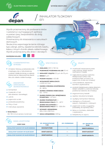 ELEKTRONIKA MEDYCZNA WYR%u00d3B MEDYCZNY HELBO sp. z o.o. ul. Tadeusza %u015aliwiaka 14A 30-797 Krak%u00f3w KODY EAN OP. JEDNOSTKOWE 1 szt. OP. PO%u015aREDNIE OP. ZBIORCZE6 szt.5902166727683 %u2015 59067426302445906742631234 %u2015 59067426334675906742631241 %u2015 5906742633474DANE LOGISTYCZNEINHALATOR T%u0141OKOWYEFICHARAK ZALETY TERYSTYKAWYROBUSPECYFIKACJAmo%u017cliwo%u015b%u0107 stosowania przez ca%u0142%u0105 rodzin%u0119, dzi%u0119ki dw%u00f3m rozmiarom masektr%u0105ba s%u0142onia opr%u00f3cz walor%u00f3w estetycznych pe%u0142ni rol%u0119 praktycznego uchwytu na pojemnik na leki do inhalacjiciche dzia%u0142anie, zapewniakomfort u%u017cytkowaniaprodukt dedykowany tak%u017ce dzieciom,dzi%u0119ki weso%u0142emu wzorowi %u0142atwiejprzekona%u0107 dziecko do inhalacjiergonomiczny kszta%u0142tszybka i skuteczna terapiawydajny kompresor t%u0142okowydost%u0119pny w 3 kolorach: szarym, niebieskim i r%u00f3%u017cowympojemnik na lek z wygodn%u0105podzia%u0142k%u0105, do aplikacji leku%u0142atwy w monta%u017cu, obs%u0142udzei czyszczeniubezpieczny w u%u017cyciuZAWARTO%u015a%u0106 OPAKOWANIAJEDNOSTKOWEGOkompresormaseczki x 2 szt.(dla dziecka i doros%u0142ego)ustnikpojemnik na lekprzew%u00f3d powietrznyfiltry x 5 szt.instrukcja u%u017cywaniaDane oraz zdj%u0119cia zawarte w karcie maj%u0105 charakter pogl%u0105dowy i mog%u0105 ulec zmianie. Wyd. 02/ 2025DOST%u0118PNE KOLORY:INHALATOR T%u0141OKOWY EFI S%u0141O%u0143 NIEBIESKIINHALATOR T%u0141OKOWY EFI S%u0141O%u0143 SZARYINHALATOR T%u0141OKOWY EFI S%u0141O%u0143 R%u00d3%u017bOWY Wyr%u00f3b przeznaczony do podawania lek%u00f3wi substancji wymagaj%u0105cych aplikacjiw postaci pary, bezpo%u015brednio do dr%u00f3goddechowych. Przeznaczony do stosowania w warunkach domowych. Skutecznie wspomaga leczenie r%u00f3%u017cnego typu alergii, astmy, zapalenia oskrzeli, kaszlu,kataru i innych chor%u00f3b uk%u0142adu oddechowego. Wyr%u00f3b przeznaczony dla dzieci i doros%u0142ych.inhalator t%u0142okowy przekszta%u0142ca lekznajduj%u0105cy si%u0119 w nebulizatorze, z postaci ciek%u0142ej do lotnej, co u%u0142atwia dostarczenie odpowiedniej dawkileku do uk%u0142adu oddechowegoTRYB PRACY: 30 / 30 minut (praca / przerwa)ZASILANIE: 220 V / 50 Hz POJEMNO%u015a%u0106 POJEMNIKA NA LEK: 10 mlWIELKO%u015a%u0106 CZ%u0104STKI: 0,5 %u00b5m do 10 %u00b5mMMAD: 5 %u00b5mPOZIOM HA%u0141ASU: %u2264 65 dBWYDAJNO%u015a%u0106 NEBULIZACJI:%u2265 0,25 ml / minZAKRES CI%u015aNIENIA KOMPRESORA:22 %u2013 58 PsiZAKRES CI%u015aNIENIA ROBOCZEGO: 9,5 %u2013 19 PsiZAKRES PRZEP%u0141YWU SPR%u0118%u017bONEGOPOWIETRZA: > 6,7 lpmZAKRES TEMPERATURY %u2014%u015aRODOWISKO PRACY: 10 %u2013 40%u00b0CZAKRES WILGOTNO%u015aCI %u2014 %u015aRODOWISKO PRACY: 10 %u2013 95% RHWYMIARY URZ%u0104DZENIA:225 x 140 x 100 mmWAGA URZ%u0104DZENIA: 1,28 kg13