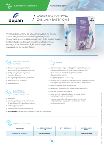 ELEKTRONIKA MEDYCZNA WYR%u00d3B MEDYCZNYHELBO sp. z o.o. ul. Tadeusza %u015aliwiaka 14A 30-797 Krak%u00f3w KODY EAN OP. JEDNOSTKOWE 1 szt. OP. PO%u015aREDNIE OP. ZBIORCZE24 szt.ASPIRATOR DO NOSA 5902166706008 %u2015 5906742631548DANE LOGISTYCZNECHARAK ZALETY TERYSTYKAWYROBUZAWARTO%u015a%u0106OPAKOWANIAJEDNOSTKOWEGOASPIRATOR DO NOSAZASILANY BATERYJNIEWyr%u00f3b przeznaczony do usuwania wydzieliny z nosa w celu przywr%u00f3cenia swobodnego oddychania. Wspomaga leczenie zaka%u017ce%u0144 g%u00f3rnych dr%u00f3g oddechowych. Systematyczne odci%u0105ganie nadmiaru %u015bluzu z nosa pomaga w zachowaniu higieny oraz zapobiega rozprzestrzenieniu si%u0119 infekcji.Dane oraz zdj%u0119cia zawarte w karcie maj%u0105 charakter pogl%u0105dowy i mog%u0105 ulec zmianie. Wyd. 02/ 2025budowa wyrobu pozwala na postawienie go w pozycji pionowejcichy w u%u017cyciu, nie wywo%u0142uje stresu u dzieckanie wymaga dodatkowych filtr%u00f3wbezpieczny w u%u017cywaniuwodoodpornyaspiratorrozmiary silikonowych ko%u0144c%u00f3wek (1 szt. dla dzieci, 1 szt. dla doros%u0142ych)instrukcja u%u017cywaniazapasowe pier%u015bcienie silikonoweWYMAGANE: 2 baterie alkaliczne 1,5 V AA (nie do%u0142%u0105czone)idealnie nadaje si%u0119 do odci%u0105gania wydzieliny z nosa u dzieci, os%u00f3b starszych oraz niepe%u0142nosprawnychdwie silikonowe ko%u0144c%u00f3wki przeznaczone dla dzieci i doros%u0142ychwygodny przycisk Start / Stopbezpieczny kszta%u0142t ko%u0144c%u00f3wki zapobiega zbyt g%u0142%u0119bokiemu wsuni%u0119ciu aspiratora oraz nie powoduje podra%u017cnie%u0144u%u0142atwia oddychanie, jedzenie i sendoskona%u0142y do u%u017cytku domowego jaki w podr%u00f3%u017cyszybkie, skuteczne dzia%u0142aniepojemnik na wydzielin%u0119 %u0142atwy w opr%u00f3%u017cnianiu oraz utrzymywaniu czysto%u015bciergonomiczny kszta%u0142t zapewnia pewny chwyt oraz zapobiega wytr%u0105ceniu urz%u0105dzenia z r%u0119kipodczas u%u017cywania14