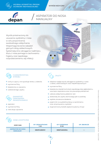 WYR%u00d3B MEDYCZNY HIGIENA, KOSMETYKI, %u015aRODKIOCHRONY INDYWIDUALNEJHELBO sp. z o.o. ul. Tadeusza %u015aliwiaka 14A 30-797 Krak%u00f3w KODY EAN OP. JEDNOSTKOWE 1 szt. OP. PO%u015aREDNIE8 szt.OP. ZBIORCZEASPIRATOR DO NOSAMANUALNY 5906742632101 5906742632354 %u2015DANE LOGISTYCZNECHARAK ZALETY TERYSTYKAWYROBUZAWARTO%u015a%u0106OPAKOWANIAJEDNOSTKOWEGOASPIRATOR DO NOSAMANUALNYWyr%u00f3b przeznaczony do usuwania wydzieliny z nosa w celu przywr%u00f3ceniaswobodnego oddychania. Wspomaga leczenie zaka%u017ce%u0144 g%u00f3rnych dr%u00f3g oddechowych. Systematyczne odci%u0105ganie nadmiaru %u015bluzu z nosa pomaga w zachowaniu higieny oraz zapobiega rozprzestrzenieniu si%u0119 infekcji.Dane oraz zdj%u0119cia zawarte w karcie maj%u0105 charakter pogl%u0105dowy i mog%u0105 ulec zmianie. Wyd. 02/ 2025cichy w u%u017cyciu, nie wywo%u0142uje stresu u dzieckawymienne filtrybezpieczny w u%u017cywaniuwielokrotnego u%u017cytku aspiratorwymienne filtry instrukcja u%u017cywaniaidealnie nadaje si%u0119 do odci%u0105gania wydzieliny z nosa u dzieci, os%u00f3b starszych oraz niepe%u0142nosprawnychwymienne filtry bezpieczny kszta%u0142t ko%u0144c%u00f3wki zapobiega zbyt g%u0142%u0119bokiemu wsuni%u0119ciu aspiratora oraz nie powoduje podra%u017cnie%u0144u%u0142atwia oddychanie, jedzenie i sendoskona%u0142y do u%u017cytku domowego jaki w podr%u00f3%u017cyszybkie, skuteczne dzia%u0142aniepojemnik na wydzielin%u0119 %u0142atwy w opr%u00f3%u017cnianiu oraz utrzymywaniu czysto%u015bciergonomiczny kszta%u0142t zapewnia pewny chwyt 15