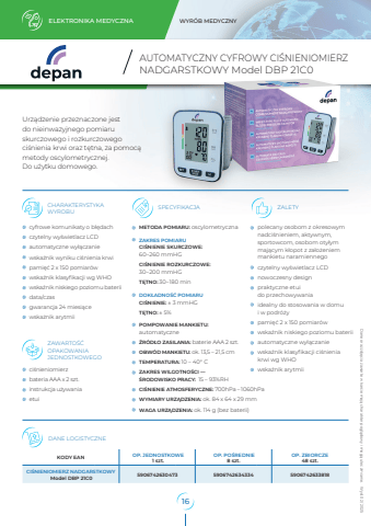 ELEKTRONIKA MEDYCZNA WYR%u00d3B MEDYCZNYHELBO sp. z o.o. ul. Tadeusza %u015aliwiaka 14A 30-797 Krak%u00f3w KODY EAN OP. JEDNOSTKOWE 1 szt. OP. PO%u015aREDNIE8 szt. 48 szt.CI%u015aNIENIOMIERZ NADGARSTKOWYModel DBP 21C0 5906742630473 5906742634334 5906742633818DANE LOGISTYCZNEAUTOMATYCZNY CYFROWY CI%u015aNIENIOMIERZNADGARSTKOWY Model DBP 21C0 Urz%u0105dzenie przeznaczone jest do nieinwazyjnego pomiaru skurczowego i rozkurczowego ci%u015bnienia krwi oraz t%u0119tna, za pomoc%u0105 metody oscylometrycznej.Do u%u017cytku domowego.CHARAK ZALETY TERYSTYKAWYROBUSPECYFIKACJApolecany osobom z okresowymnadci%u015bnieniem, aktywnym, sportowcom, osobom oty%u0142ym maj%u0105cym k%u0142opot z za%u0142o%u017ceniem mankietu naramiennegoczytelny wy%u015bwietlacz LCDnowoczesny designpraktyczne etui do przechowywaniaidealny do stosowania w domui w podr%u00f3%u017cypami%u0119%u0107 2 x 150 pomiar%u00f3wwska%u017anik niskiego poziomu bateriiautomatyczne wy%u0142%u0105czaniewska%u017anik klasyfikacji ci%u015bnieniakrwi wg WHOwska%u017anik arytmiiMETODA POMIARU: oscylometrycznaZAKRES POMIARU CI%u015aNIENIE SKURCZOWE:60%u2212260 mmHGCI%u015aNIENIE ROZKURCZOWE:30%u2212200 mmHGT%u0118TNO: 30%u2212180 minDOK%u0141ADNO%u015a%u0106 POMIARUCI%u015aNIENIE: %u00b1 3 mmHGT%u0118TNO: %u00b1 5%POMPOWANIE MANKIETU:automatyczne%u0179R%u00d3D%u0141O ZASILANIA: baterie AAA 2 szt.OBW%u00d3D MANKIETU: ok. 13,5 %u2013 21,5 cmTEMPERATURA: 10 %u2013 40%u00b0 CZAKRES WILGOTNO%u015aCI %u2014%u015aRODOWISKO PRACY: 15 %u2013 93%RHCI%u015aNIENIE ATMOSFERYCZNE: 700hPa %u2013 1060hPaWYMIARY URZ%u0104DZENIA: ok. 84 x 64 x 29 mmWAGA URZ%u0104DZENIA: ok. 114 g (bez baterii) cyfrowe komunikaty o b%u0142%u0119dachczytelny wy%u015bwietlacz LCDautomatyczne wy%u0142%u0105czaniewska%u017anik wyniku ci%u015bnienia krwipami%u0119%u0107 2 x 150 pomiar%u00f3wwska%u017anik klasyfikacji wg WHOwska%u017anik niskiego poziomu bateriidata/czasgwarancja 24 miesi%u0105cewska%u017cnik arytmii ZAWARTO%u015a%u0106OPAKOWANIAJEDNOSTKOWEGOci%u015bnieniomierzbateria AAA x 2 szt.instrukcja u%u017cywaniaetuiDane oraz zdj%u0119cia zawarte w karcie maj%u0105 charakter pogl%u0105dowy i mog%u0105 ulec zmianie. Wyd. 02/ 2025OP. ZBIORCZE16