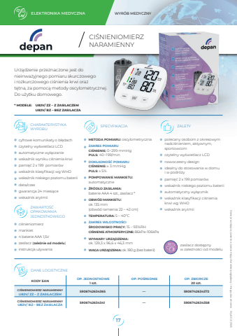 ELEKTRONIKA MEDYCZNA WYR%u00d3B MEDYCZNY* MODELE: U82V/ ZZ %u2013 Z ZASILACZEM U82V/ BZ %u2013 BEZ ZASILACZAHELBO sp. z o.o. ul. Tadeusza %u015aliwiaka 14A 30-797 Krak%u00f3w www.helbo.plKODY EAN OP. JEDNOSTKOWE 1 szt. 20 szt.CI%u015aNIENIOMIERZ NARAMIENNYU82V/ ZZ %u2013 Z ZASILACZEM5906742634365 %u2015 5906742634372CI%u015aNIENIOMIERZ NARAMIENNYU82V/ BZ %u2013 BEZ ZASILACZA 5906742634341 %u2015 5906742634358DANE LOGISTYCZNECI%u015aNIENIOMIERZNARAMIENNY ZALETY CHARAKTERYSTYKAWYROBU SPECYFIKACJApolecany osobom z okresowymnadci%u015bnieniem, aktywnym, sportowcomczytelny wy%u015bwietlacz LCDnowoczesny designidealny do stosowania w domui w podr%u00f3%u017cypami%u0119%u0107 2 x 199 pomiar%u00f3wwska%u017anik niskiego poziomu bateriiautomatyczny wy%u0142%u0105cznikwska%u017anik klasyfikacji ci%u015bnieniakrwi wg WHOwska%u017anik arytmiiMETODA POMIARU: oscylometrycznaZAKRES POMIARU CI%u015aNIENIE: 0~299 mmHgPULS: 40~199/minDOK%u0141ADNO%u015a%u0106 POMIARUCI%u015aNIENIE: %u00b1 3 mmHgPULS: %u00b1 5%POMPOWANIE MANKIETU:automatyczne%u0179R%u00d3D%u0141O ZASILANIA:baterie AAA 4 szt., zasilacz *OBW%u00d3D MANKIETU:ok. 135 mm (obw%u00f3d ramienia 22 %u2013 42 cm)TEMPERATURA: 5 %u2013 400CZAKRES WILGOTNO%u015aCI%u015aRODOWISKO PRACY: 15 %u2013 93%RHCI%u015aNIENIE ATMOSFERYCZNE: 86kPa~106kPaWYMIARY URZ%u0104DZENIA: ok. 129,3 x 96,6 x 46,3 mmWAGA URZ%u0104DZENIA: ok. 180 g (bez baterii)cyfrowe komunikaty o b%u0142%u0119dachczytelny wy%u015bwietlacz LCDautomatyczne wy%u0142%u0105czaniewska%u017anik wyniku ci%u015bnienia krwipami%u0119%u0107 2 x 199 pomiar%u00f3wwska%u017anik klasyfikacji wg WHOwska%u017anik niskiego poziomu bateriidata/czasgwarancja 24 miesi%u0105cewska%u017cnik arytmii ZAWARTO%u015a%u0106OPAKOWANIAJEDNOSTKOWEGOci%u015bnieniomierzmankiet4 baterie AAA 1,5V zasilacz (zale%u017cnie od modelu)instrukcja u%u017cywaniaDane oraz zdj%u0119cia zawarte w karcie maj%u0105 charakter pogl%u0105dowy i mog%u0105 ulec zmianie. Wyd. 02/ 2025 OP. PO%u015aREDNIE OP. ZBIORCZEzasilacz dost%u0119pnyw zale%u017cno%u015bci od modeluUrz%u0105dzenie przeznaczone jest do nieinwazyjnego pomiaru skurczowego i rozkurczowego ci%u015bnienia krwi oraz t%u0119tna, za pomoc%u0105 metody oscylometrycznej.Do u%u017cytku domowego.17