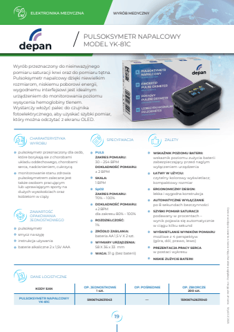 ELEKTRONIKA MEDYCZNA WYR%u00d3B MEDYCZNYCHARAKTERYSTYKAWYROBUZAWARTO%u015a%u0106OPAKOWANIAJEDNOSTKOWEGOpulsoksymetr przeznaczony dla os%u00f3b, kt%u00f3re borykaj%u0105 sie z chorobami ukladu oddechowego, chorobami serca, nadcisnieniem, cukrzyc%u0105monitorowanie stanu zdrowia pulsoksymetrem zalecane jest tak%u017ce osobom pracuj%u0105cym lub uprawiaj%u0105cym sporty na du%u017cych wysoko%u015bciach oraz kobietom w ci%u0105%u017cypulsoksymetr smycz na szyj%u0119instrukcja u%u017cywaniabaterie alkaliczne 2 x 1,5V AAA SPECYFIKACJA ZALETYPULSZAKRES POMIARU:30 %u2013 254 BPMDOK%u0141ADNO%u015a%u0106 POMIARU:%u00b1 2 BPM SKALA:1 BPMSpO2 ZAKRES POMIARU: 70% %u2013 100%DOK%u0141ADNO%u015a%u0106 POMIARU:%u00b1 2 BPM dla zakresu 80% %u2013 100%ROZDZIELCZO%u015a%u0106:1%ZR%u00d3D%u0141O ZASILANIA:bateria AA 1,5 V X 2 szt.WYMIARY URZ%u0104DZENIA: 58 X 36 x 33 mmWAGA: 31 g (bez baterii)WSKA%u0179NIK POZIOMU BATERII:wskaznik poziomu zu%u017cycia baterii zabezpieczaj%u0105cy przed naglym wy%u0142%u0105czeniem urz%u0105dzenia%u0141ATWY W U%u017bYCIU:czytelny kolorowy wy%u015bwietlacz; kompaktowy rozmiarERGONOMICZNY DESIGN:lekka i wygodna konstrukcja AUTOMATYCZNE WY%u0141%u0104CZANIEpo 8 sekundach bezczynno%u015bciSZYBKI POMIAR SATURACJI podawany w procentach %u2013 wynik pojawia si%u0119 automatycznie w ci%u0105gu kilku sekundWY%u015aWIETLANIE WYNIK%u00d3W POMIARUmo%u017cliwe z 4 perspektyw (g%u00f3ra, d%u00f3l, prawo, lewo)PREZENTACJA PRACY SERCAw postaci wykresuNISKIE ZU%u017bYCIE BATERIIHELBO sp. z o.o. ul. Tadeusza %u015aliwiaka 14A 30-797 Krak%u00f3w KODY EAN OP. JEDNOSTKOWE 1 szt. OP. PO%u015aREDNIE OP. ZBIORCZE200 szt.PULSOKSYMETR NAPALCOWYYK-81C %u2015DANE LOGISTYCZNEPULSOKSYMETR NAPALCOWYMODEL YK-81CDane oraz zdj%u0119cia zawarte w karcie maj%u0105 charakter pogl%u0105dowy i mog%u0105 ulec zmianie. Wyd. 02/ 20255906742631043 15906742631040Wyr%u00f3b przeznaczony do nieinwazyjnego pomiaru saturacji krwi oraz do pomiaru t%u0119tna. Pulsoksymetr napalcowy dzi%u0119ki niewielkim rozmiarom, niskiemu poborowi energii, wygodnemu interfejsowi jest idealnymurz%u0105dzeniem do monitorowania poziomu wysycenia hemoglobiny tlenem. Wystarczy w%u0142o%u017cy%u0107 palec do czujnika fotoelektrycznego, aby uzyska%u0107 szybki pomiar, kt%u00f3ry mo%u017cna odczyta%u0107 z ekranu OLED.19