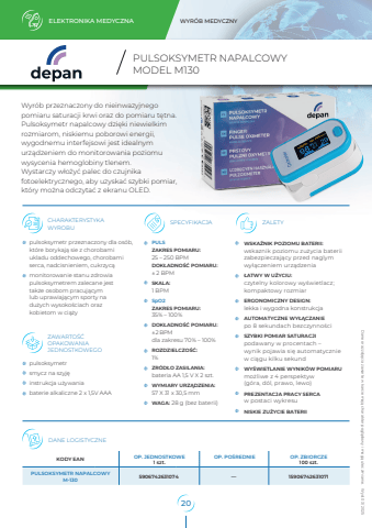 ELEKTRONIKA MEDYCZNA WYR%u00d3B MEDYCZNYHELBO sp. z o.o. ul. Tadeusza %u015aliwiaka 14A 30-797 Krak%u00f3w www.helbo.plKODY EAN OP. JEDNOSTKOWE 1 szt. OP. PO%u015aREDNIE OP. ZBIORCZE100 szt.PULSOKSYMETR NAPALCOWYM-130 %u2015DANE LOGISTYCZNECHARAKTERYSTYKAWYROBUZAWARTO%u015a%u0106OPAKOWANIAJEDNOSTKOWEGOPULSOKSYMETR NAPALCOWY MODEL M130Dane oraz zdj%u0119cia zawarte w karcie maj%u0105 charakter pogl%u0105dowy i mog%u0105 ulec zmianie. Wyd. 03/ 2025pulsoksymetr przeznaczony dla os%u00f3b, kt%u00f3re borykaj%u0105 sie z chorobami ukladu oddechowego, chorobami serca, nadcisnieniem, cukrzyc%u0105monitorowanie stanu zdrowia pulsoksymetrem zalecane jest tak%u017ce osobom pracuj%u0105cym lub uprawiaj%u0105cym sporty na du%u017cych wysoko%u015bciach oraz kobietom w ci%u0105%u017cypulsoksymetr smycz na szyj%u0119instrukcja u%u017cywaniabaterie alkaliczne 2 x 1,5V AAA 5906742631074 15906742631071SPECYFIKACJA ZALETYPULSZAKRES POMIARU:25 %u2013 250 BPMDOK%u0141ADNO%u015a%u0106 POMIARU:%u00b1 2 BPM SKALA:1 BPMSpO2 ZAKRES POMIARU: 35% %u2013 100%DOK%u0141ADNO%u015a%u0106 POMIARU:%u00b1 2 BPM dla zakresu 70% %u2013 100%ROZDZIELCZO%u015a%u0106:1%ZR%u00d3D%u0141O ZASILANIA:bateria AA 1,5 V X 2 szt.WYMIARY URZ%u0104DZENIA: 57 X 31 x 30,5 mmWAGA: 28 g (bez baterii)WSKA%u0179NIK POZIOMU BATERII:wskaznik poziomu zu%u017cycia baterii zabezpieczaj%u0105cy przed naglym wy%u0142%u0105czeniem urz%u0105dzenia%u0141ATWY W U%u017bYCIU:czytelny kolorowy wy%u015bwietlacz; kompaktowy rozmiarERGONOMICZNY DESIGN:lekka i wygodna konstrukcja AUTOMATYCZNE WY%u0141%u0104CZANIEpo 8 sekundach bezczynno%u015bciSZYBKI POMIAR SATURACJI podawany w procentach %u2013 wynik pojawia si%u0119 automatycznie w ci%u0105gu kilku sekundWY%u015aWIETLANIE WYNIK%u00d3W POMIARUmo%u017cliwe z 4 perspektyw (g%u00f3ra, d%u00f3l, prawo, lewo)PREZENTACJA PRACY SERCAw postaci wykresuNISKIE ZU%u017bYCIE BATERIIWyr%u00f3b przeznaczony do nieinwazyjnego pomiaru saturacji krwi oraz do pomiaru t%u0119tna. Pulsoksymetr napalcowy dzi%u0119ki niewielkim rozmiarom, niskiemu poborowi energii, wygodnemu interfejsowi jest idealnymurz%u0105dzeniem do monitorowania poziomu wysycenia hemoglobiny tlenem. Wystarczy w%u0142o%u017cy%u0107 palec do czujnika fotoelektrycznego, aby uzyska%u0107 szybki pomiar, kt%u00f3ry mo%u017cna odczyta%u0107 z ekranu OLED.20