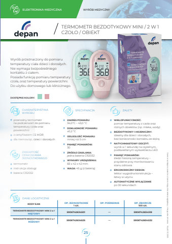 ELEKTRONIKA MEDYCZNA WYR%u00d3B MEDYCZNY HELBO sp. z o.o. ul. Tadeusza %u015aliwiaka 14A 30-797 Krak%u00f3w www.helbo.pl KODY EAN OP. JEDNOSTKOWE 1 szt. OP. PO%u015aREDNIE OP. ZBIORCZE100 szt.TERMOMETR BEZDOTYKOWY MINI 2 w 1MI%u0118TOWY 5906742634501 %u2015 5906742634518TERMOMETR BEZDOTYKOWY MINI 2 w 1R%u00d3%u017bOWY 5906742634525 %u2015 5906742634532DANE LOGISTYCZNECHARAK ZALETY TERYSTYKAWYROBUSPECYFIKACJAZAWARTO%u015a%u0106 OPAKOWANIAJEDNOSTKOWEGOTERMOMETR BEZDOTYKOWY MINI / 2 W 1CZO%u0141O / OBIEKTDOST%u0118PNE KOLORY:Wyr%u00f3b przeznaczony do pomiarutemperatury cia%u0142a dzieci i doros%u0142ych. Nie wymaga bezpo%u015bredniego kontaktu z cia%u0142em. Posiada funkcj%u0119 pomiaru temperatury czo%u0142a, oraz temperatury powierzchni. Do u%u017cytku domowego lub klinicznego.ZAKRES POMIARU:34,0%u00b0C %u2013 43,0 %u00b0CDOK%u0141ADNO%u015a%u0106 POMIARU:%u00b10,2 %u00b0C ODLEG%u0141O%u015a%u0106 POMIARU:mniej ni%u017c 5 cmPAMI%u0118%u0106 POMIAR%u00d3W:30 ZR%u00d3D%u0141O ZASILANIA:jedna bateria CR2032 WYMIARY URZ%u0104DZENIA: 83 x 42 x 42 mmWAGA: 45 g (z bateri%u0105)Dane oraz zdj%u0119cia zawarte w karcie maj%u0105 charakter pogl%u0105dowy i mog%u0105 ulec zmianie. Wyd. 03/ 2025przeno%u015bny termometr na podczerwie%u0144 do pomiaru temperatury czo%u0142a oraz powierzchni z certyfikatem CE MDR dla niemowl%u0105t, dzieci i doros%u0142ychtermometrinstrukcja obs%u0142ugibateria CR2032WIELOFUNKCYJNO%u015a%u0106:pomiar temperatury z czo%u0142a oraz r%u00f3%u017cnych obiekt%u00f3w (np. mleka, wody)BEZDOTYKOWY I HIGIENICZNY:idealny dla dzieci i doros%u0142ych, bez konieczno%u015bci kontaktu ze sk%u00f3r%u0105NATYCHMIASTOWY ODCZYT:wynik w 1 sekund%u0119 na czytelnym, pod%u015bwietlanym wy%u015bwietlaczu LEDPAMI%u0118%u0106 POMIAR%u00d3W:%u015bledzi histori%u0119 temperatury %u2013 przydatne przy monitorowaniu stanu zdrowiaERGONOMICZNY DESIGN:lekka i wygodna konstrukcja %u2013 %u0142atwy w u%u017cyciuAUTOMATYCZNE WY%u0141%u0104CZANIEpo 30 sekundach25