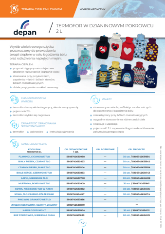 TERAPIA CIEP%u0141EM I ZIMNEM WYR%u00d3B MEDYCZNY%u2015%u2015HELBO sp. z o.o. ul. Tadeusza %u015aliwiaka 14A 30-797 Krak%u00f3w CHARAK ZALETY TERYSTYKAWYROBUDANE LOGISTYCZNEstosowany w celach profilaktyczno-leczniczych do ogrzewania i %u0142agodzenia b%u00f3luniezast%u0105piony przy b%u00f3lach menstruacyjnychwygodne stosowanie na r%u00f3%u017cne cz%u0119%u015bci cia%u0142arelaksuje i uspokajapojemno%u015b%u0107 2 L zapewnia d%u0142ugotrwa%u0142e oddawaniezakumulowanego ciep%u0142aFLAMINGI, CYJANOWE T%u0141O %u2015 30 szt. / 5906742631654%u2015 30 szt. / 5906742633559KODY EAN 1 szt.Wyr%u00f3b wielokrotnego u%u017cytkuprzeznaczony do prowadzenia terapii ciep%u0142em w celu %u0142agodzenia b%u00f3luoraz rozlu%u017anienia napi%u0119tych mi%u0119%u015bni.TERAPIA CIEP%u0141EM:przynosi ulg%u0119 poprzez miejscowedzia%u0142anie rozkurczowe (ogrzanie cia%u0142a)stosowana przy przykurczach,zapaleniu mi%u0119%u015bni i b%u00f3lach staw%u00f3w,b%u00f3lach menstruacyjnychdzia%u0142a pozytywnie na uk%u0142ad nerwowy TERMOFOR W DZIANINOWYM POKROWCU2 L Dane oraz zdj%u0119cia zawarte w karcie maj%u0105 charakter pogl%u0105dowy i mog%u0105 ulec zmianie. Wyd. 02/ 2025termofor do nape%u0142niania gor%u0105c%u0105, ale nie wrz%u0105c%u0105 wod%u0105pojemno%u015b%u0107 2 Ltermofor szybko si%u0119 nagrzewaOP. ZBIORCZETERMOFOR 2 LCZARNY PIESEK, BIA%u0141E T%u0141OMUFFINKA, BORDOWE T%u0141O 5906742630909 %u2015 30 szt. / 5906742631661%u0141APKI, NIEBIESKIE T%u0141O 5906742633740 %u2015 30 szt. / 5906742634228BIA%u0141Y PIESEK, CZARNE T%u0141O %u2015 30 szt. / 5906742633542BIA%u0141E SERCE, CZERWONE T%u0141O %u2015 30 szt. / 5906742634143SOWA, NIEBIESKIE T%u0141O W PASKI 5906742633832 %u2015 30 szt. / 5906742634136%u2015 30 szt. / 59067426341745906742633856 %u2015 OP. PO%u015aREDNIEZAWARTO%u015a%u0106 OPAKOWANIAJEDNOSTKOWEGOtermofor pokrowiec instrukcja u%u017cywania OP. JEDNOSTKOWE59067426309305906742633504SOWA, T%u0141O CZARNO-%u017b%u00d3%u0141TE PASKI 5906742634167ZYGZAK CZERWONY, CZARNY, ZIELONY 5906742633849 %u2015BEZ POKROWCA, NIEBIESKA GUMA 5906742631630 %u2015 50 szt. / 5906742634129PINGWIN, GRANATOWE T%u0141ONAPIS GOOD NIGHT 5906742632804 %u2015 30 szt. / 59067426341125906742630923590674263386332