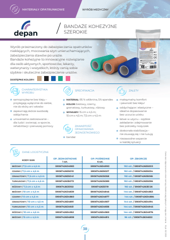 MATERIA%u0141Y OPATRUNKOWE WYR%u00d3B MEDYCZNYHELBO sp. z o.o. ul. Tadeusza %u015aliwiaka 14A 30-797 Krak%u00f3w KODY EAN OP. JEDNOSTKOWE 1 szt. OP. PO%u015aREDNIE 6 szt.OP. ZBIORCZEBE%u017bOWY / 15 cm x 4,5 m 5906742634808 5906742634815 96 szt. / 5906742634822R%u00d3%u017bOWY / 10 cm x 4,5 m 5906742634952 5906742634969 144 szt. / 5906742634976BE%u017bOWY / 7,5 cm x 4,5 m 5906742634983 5906742634990 192 szt. / 5906742635003CZARNY / 7,5 cm x 4,5 m 5906742635010 5906742635027 192 szt. / 5906742635034GRANATOWY / 7,5 cm x 4,5 m 5906742635041 5906742635058 192 szt. / 5906742635065TURKUSOWY / 7,5 cm x 4,5 m 5906742635072 5906742635089 192 szt. / 59067426350965906742635102 5906742635119 192 szt. / 5906742635126BE%u017bOWY / 10 cm x 4,5 m 5906742634839 5906742634846 144 szt. / 5906742634853DANE LOGISTYCZNEWyr%u00f3b przeznaczony do zabezpieczania opatrunk%u00f3w nieklej%u0105cych, mocowania szyn unieruchamiaj%u0105cych, zabezpieczania staw%u00f3w po urazie.Banda%u017ce kohezyjne to innowacyjne rozwi%u0105zanie dla os%u00f3b aktywnych, sportowc%u00f3w, lekarzy, weterynarzy i wszystkich, kt%u00f3rzy ceni%u0105 sobie szybkie i skuteczne zabezpieczenie uraz%u00f3w.CHARAK ZALETY TERYSTYKAWYROBUSPECYFIKACJAmaksymalny komfort i pewno%u015b%u0107 bez kleju!oddychaj%u0105ce i elastyczne %u2013 idealne dopasowanie bez uczucia ucisku%u0142atwe w u%u017cyciu %u2013 szybkiezak%u0142adanie i zdejmowanie bez potrzeby no%u017cyczekdoskona%u0142a stabilizacja %u2013 nie zsuwaj%u0105 si%u0119 i nie luzuj%u0105niezawodne wsparcie w ka%u017cdej sytuacjiMATERIA%u0141: 95 % w%u0142%u00f3knina, 5% spandexKOLOR: be%u017cowy, czarny, granatowy, turkusowy, r%u00f3%u017cowyWYMIARY: 15 cm x 4,5 m;10 cm x 4,5 m; 7,5 cm x 4,5 msamoprzylepne bez kleju %u2013 przylegaj%u0105 wy%u0142%u0105cznie do siebie, nie do sk%u00f3ry ani w%u0142os%u00f3wzapewniaj%u0105 sk%u00f3rze swobod%u0119 oddychaniauniwersalne zastosowanie %u2013 dla ludzi i zwierz%u0105t, w sporcie, rehabilitacji i pierwszej pomocy ZAWARTO%u015a%u0106OPAKOWANIAJEDNOSTKOWEGObanda%u017cDane oraz zdj%u0119cia zawarte w karcie maj%u0105 charakter pogl%u0105dowym i mog%u0105 ulec zmianie. Wyd. 02/ 2025DOST%u0118PNE KOLORY:SZEROKIEBANDA%u017bE KOHEZYJNECZARNY / 10 cm x 4,5 m 5906742634860 5906742634877 144 szt. / 5906742634884GRANATOWY / 10 cm x 4,5 m 5906742634891 5906742634907 144 szt. / 5906742634914TURKUSOWY / 10 cm x 4,5 m 5906742634921 5906742634938 144 szt. / 5906742634945R%u00d3%u017bOWY / 7,5 cm x 4,5 m38