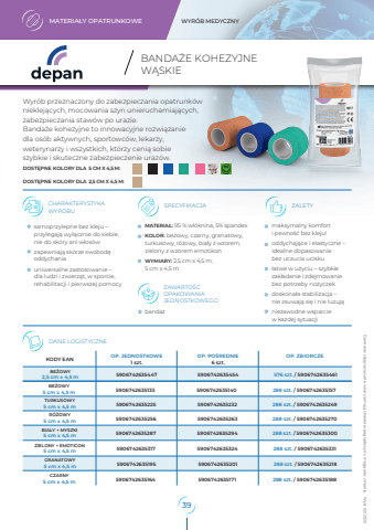 MATERIA%u0141Y OPATRUNKOWE WYR%u00d3B MEDYCZNYsamoprzylepne bez kleju %u2013 przylegaj%u0105 wy%u0142%u0105cznie do siebie, nie do sk%u00f3ry ani w%u0142os%u00f3wzapewniaj%u0105 sk%u00f3rze swobod%u0119 oddychaniauniwersalne zastosowanie %u2013 dla ludzi i zwierz%u0105t, w sporcie, rehabilitacji i pierwszej pomocyHELBO sp. z o.o. ul. Tadeusza %u015aliwiaka 14A 30-797 Krak%u00f3w KODY EAN OP. JEDNOSTKOWE 1 szt. OP. PO%u015aREDNIE 6 szt.OP. ZBIORCZECZARNY5 cm x 4,5 m 5906742635164 5906742635171 288 szt. / 5906742635188GRANATOWY5 cm x 4,5 m 5906742635195 5906742635201 288 szt. / 5906742635218TURKUSOWY5 cm x 4,5 m 5906742635225 5906742635232 288 szt. / 5906742635249R%u00d3%u017bOWY5 cm x 4,5 m 5906742635256 5906742635263 288 szt. / 5906742635270BIA%u0141Y + MYSZKI5 cm x 4,5 m 5906742635287 5906742635294 288 szt. / 5906742635300BE%u017bOWY5 cm x 4,5 m 5906742635133 5906742635140 288 szt. / 5906742635157BE%u017bOWY2,5 cm x 4,5 m 5906742635447 5906742635454 576 szt. / 5906742635461ZIELONY + EMOTICON5 cm x 4,5 m 5906742635317 5906742635324 288 szt. / 5906742635331DANE LOGISTYCZNEWyr%u00f3b przeznaczony do zabezpieczania opatrunk%u00f3w nieklej%u0105cych, mocowania szyn unieruchamiaj%u0105cych, zabezpieczania staw%u00f3w po urazie.Banda%u017ce kohezyjne to innowacyjne rozwi%u0105zanie dla os%u00f3b aktywnych, sportowc%u00f3w, lekarzy, weterynarzy i wszystkich, kt%u00f3rzy ceni%u0105 sobie szybkie i skuteczne zabezpieczenie uraz%u00f3w.CHARAK ZALETY TERYSTYKAWYROBUSPECYFIKACJAmaksymalny komfort i pewno%u015b%u0107 bez kleju!oddychaj%u0105ce i elastyczne %u2013 idealne dopasowanie bez uczucia ucisku%u0142atwe w u%u017cyciu %u2013 szybkiezak%u0142adanie i zdejmowanie bez potrzeby no%u017cyczekdoskona%u0142a stabilizacja %u2013 nie zsuwaj%u0105 si%u0119 i nie luzuj%u0105niezawodne wsparcie w ka%u017cdej sytuacjiMATERIA%u0141: 95 % w%u0142%u00f3knina, 5% spandexKOLOR: be%u017cowy, czarny, granatowy, turkusowy, r%u00f3%u017cowy, bia%u0142y z wzorem,zielony z wzorem emotikonWYMIARY: 2,5 cm x 4,5 m; 5 cm x 4,5 mZAWARTO%u015a%u0106OPAKOWANIAJEDNOSTKOWEGObanda%u017cDane oraz zdj%u0119cia zawarte w karcie maj%u0105 charakter pogl%u0105dowym i mog%u0105 ulec zmianie. Wyd. 02/ 2025DOST%u0118PNE KOLORY DLA 5 CM X 4,5 M:DOST%u0118PNE KOLORY DLA 2,5 CM X 4,5 M:W%u0104SKIEBANDA%u017bE KOHEZYJNE39