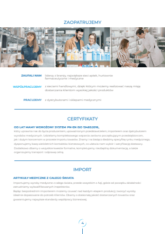ZAOPATRUJEMY CERTYFIKATYliderzy z bran%u017cy, najwi%u0119ksze sieci aptek, hurtownie farmaceutyczne i medycznez sieciami handlowymi, dzi%u0119ki kt%u00f3rym mo%u017cemy realizowa%u0107 nasz%u0105 misj%u0119 dostarczania klientom wysokiej jako%u015bci produkt%u00f3wz dystrybutorami i sklepami medycznymiZAUFALI NAMWSP%u00d3%u0141PRACUJEMYPRACUJEMYOD LAT MAMY WDRO%u017bONY SYSTEM PN-EN ISO 13485:2016,kt%u00f3ry uprawnia nas do bycia producentem, upowa%u017cnionym przedstawicielem, importerem oraz dystrybutorem wyrob%u00f3w medycznych. Udzielamy kompleksowego wsparcia zar%u00f3wno pocz%u0105tkuj%u0105cym przedsi%u0119biorcom, jak i du%u017cym koncernom w procesie importu towar%u00f3w. Znamy i na bie%u017c%u0105co %u015bledzimy specyfik%u0119 rynku medycznego, dysponujemy baz%u0105 wieloletnich kontakt%u00f3w biznesowych, co u%u0142atwia nam wyb%u00f3r i weryfikacj%u0119 dostawcy. Dodatkowo dbamy o wszystkie kwestie formalne, kompletujemy niezb%u0119dn%u0105 dokumentacj%u0119, a tak%u017ce organizujemy transport i odpraw%u0119 celn%u0105.IMPORTARTYKU%u0141Y MEDYCZNE Z CA%u0141EGO %u015aWIATAImportujemy wyroby medyczne z ca%u0142ego %u015bwiata, przede wszystkim z Azji, gdzie od pocz%u0105tku dzia%u0142alno%u015bci zatrudniamy wykwalifikowanych inspektor%u00f3w.B%u0119d%u0105c bezpo%u015brednim importerem mo%u017cemy czuwa%u0107 nad ka%u017cdym etapem produkcji, tworzy%u0107 wyroby idealnie dopasowane do potrzeb Klient%u00f3w. Dbamy o doskona%u0142%u0105 jako%u015b%u0107 dostarczanych towar%u00f3w oraz gwarantujemy najwy%u017csze standardy wsp%u00f3%u0142pracy biznesowej.4