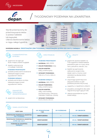 AKCESORIA WYR%u00d3B MEDYCZNYHELBO sp. z o.o. ul. Tadeusza %u015aliwiaka 14A 30-797 Krak%u00f3w www.helbo.plpojemnik na lekarstwaZAWARTO%u015a%u0106OPAKOWANIAJEDNOSTKOWEGOCHARAKTERYSTYKAWYROBUpojemnik zawiera kasetki na 7 dni tygodnia. Ka%u017cda kasetka podzielona jest na 4 pory dnia: rano, po%u0142udnie, wiecz%u00f3r, nockasetki s%u0105 wyjmowane ca%u0142kowicie z pojemnika,dzi%u0119ki czemu mo%u017cna nosi%u0107 ca%u0142odzienn%u0105 dawk%u0119 lek%u00f3w przy sobiewspomaga systematyczneza%u017cywanie lek%u00f3w co jest podstaw%u0105 skutecznej kuracjiwygodny w nape%u0142nianiu lekamiprzydatny szczeg%u00f3lnie dla os%u00f3bregularnie przyjmuj%u0105cych lekiu%u0142atwia sprawdzenie czy lek zosta%u0142 za%u017cytyZALETYPOJEMNIK PROSTOK%u0104TNYMATERIA%u0141: ABS, PPPSKOLOR POJEMNIKA: bia%u0142yKOLOR KASETEK:bia%u0142y, prze%u017aroczystyWYMIARY POJEMNIKA:12,8 cm x 11 cm x 3,8 cmPOJEMNIK OKR%u0104G%u0141YMATERIA%u0141: ABS, PPPSKOLOR POJEMNIKA:bia%u0142y, prze%u017aroczystyKOLOR KASETEK:%u017c%u00f3%u0142ty, ciemno%u017c%u00f3%u0142ty, pomara%u0144czowy, czerwony, niebieski, fioletowy, r%u00f3%u017cowyWYMIARY POJEMNIKA:9 cm x 9 cm x 10 cmSPECYFIKACJAWyr%u00f3b przeznaczony do przechowywania lek%u00f3w w postaci tabletek lub kapsu%u0142ek. U%u0142atwia dawkowanie lek%u00f3w w ci%u0105gu ca%u0142ego tygodnia.TYGODNIOWY POJEMNIK NA LEKARSTWADane oraz zdj%u0119cia zawarte w karcie maj%u0105 charakter pogl%u0105dowym i mog%u0105 ulec zmianie. Wyd. 02/ 2025pojemnik nie zajmuje du%u017co miejsca, %u0142adnie wygl%u0105dakasetki wykonane s%u0105 z trwa%u0142ego materia%u0142uPOJEMNIK PROSTOK%u0104TNYposiada przesuwane otwieranie zabezpieczaj%u0105ce przed wypadaniem lek%u00f3wPOJEMNIK OKR%u0104G%u0141Yposiada zamkni%u0119cia na klips zabezpieczaj%u0105ce przed wypadaniem lek%u00f3w5906742631364 40 szt. / 5906742633924 DNI TYGODNIA %u201550 szt. / 5906742635430 POJEMNIK NA LEKARSTWA 5906742631357 OKR%u0104G%u0141Y %u201540 szt. / 5906742633948 PROSTOK%u0104TNY POJEMNIK NA LEKARSTWA 5906742633931 CYFRY OD 1 DO 7 %u2015DANE LOGISTYCZNEKODY EANDOST%u0118PNE MODELE: PROSTOK%u0104TNY (DNI TYGODNIA) / PROSTOK%u0104TNY (CYFRY OD 1 DO 7) / OKR%u0104G%u0141Y1 szt.OP. ZBIORCZEPROSTOK%u0104TNY POJEMNIK NA LEKARSTWA OP. JEDNOSTKOWE OP. PO%u015aREDNIE48