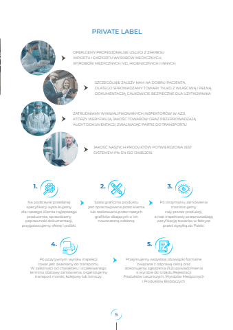 PRIVATE LABELOFERUJEMY PROFESJONALNE US%u0141UGI Z ZAKRESU IMPORTU I EKSPORTU WYROB%u00d3W MEDYCZNYCH, WYROB%u00d3W MEDYCZNYCH IVD, HIGIENICZNYCH I INNYCHZATRUDNIAMY WYKWALIFIKOWANYCH INSPEKTOR%u00d3W W AZJI, KT%u00d3RZY WERYFIKUJ%u0104 JAKO%u015a%u0106 TOWAR%u00d3W ORAZ PRZEPROWADZAJ%u0104 AUDYT DOKUMENTACJI, ZWALNIAJ%u0104C PARTIE DO TRANSPORTUJAKO%u015a%u0106 NASZYCH PRODUKT%u00d3W POTWIERDZONA JEST SYSTEMEM PN-EN ISO 13485:2016Po pozytywnym wyniku inspekcji towar jest zwalniany do transportu. W zale%u017cno%u015bci od charakteru i oczekiwanego terminu dostawy zam%u00f3wienia, organizujemy transport morski, kolejowy lub lotniczy.SZCZEG%u00d3LNIE ZALE%u017bY NAM NA DOBRU PACJENTA, DLATEGO SPROWADZAMY TOWARY TYLKO Z W%u0141A%u015aCIW%u0104 I PE%u0141N%u0104 DOKUMENTACJ%u0104, CA%u0141KOWICIE BEZPIECZNE DLA U%u017bYTKOWNIKANa podstawie przes%u0142anej specyfikacji wyszukujemy dla naszego Klienta najlepszego producenta, sprawdzamy poprawno%u015b%u0107 dokumentacji, przygotowujemy ofert%u0119 i pr%u00f3bki.Po otrzymaniu zam%u00f3wienia monitorujemy ca%u0142y proces produkcji, a nasi inspektorzy przeprowadzaj%u0105 weryfikacj%u0119 towar%u00f3w w fabryce przed wysy%u0142k%u0105 do Polski.Szata graficzna produktu jest opracowywana przez klienta lub realizowana przez naszychgrafik%u00f3w dbaj%u0105cych o ich nowoczesn%u0105 ods%u0142on%u0119.Przejmujemy wszystkie obowi%u0105zki formalne zwi%u0105zane z odpraw%u0105 celn%u0105 oraz dokonujemy zg%u0142oszenia i/lub powiadomienia o wyrobie do Urz%u0119du Rejestracji Produkt%u00f3w Leczniczych, Wyrob%u00f3w Medycznychi Produkt%u00f3w Biob%u00f3jczych.1. 2. 3.4. 5.5