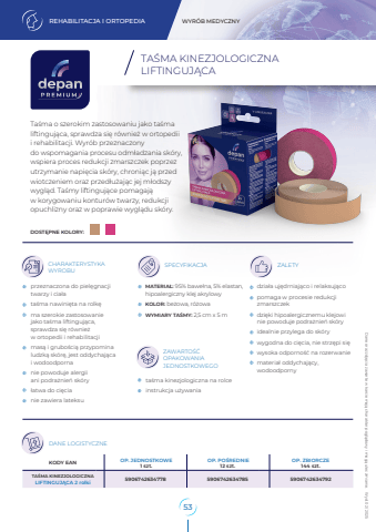 REHABILITACJA I ORTOPEDIA WYR%u00d3B MEDYCZNY12 szt.5906742634792HELBO sp. z o.o. ul. Tadeusza %u015aliwiaka 14A 30-797 Krak%u00f3w KODY EAN 1 szt.TA%u015aMA KINEZJOLOGICZNA 5906742634778 OP. JEDNOSTKOWE OP. ZBIORCZE144 szt.LIFTINGUJ%u0104CA 2 rolki 5906742634785 DANE LOGISTYCZNEta%u015bma kinezjologiczna na rolceinstrukcja u%u017cywania ZAWARTO%u015a%u0106 OPAKOWANIAJEDNOSTKOWEGOdzia%u0142a uj%u0119drniaj%u0105co i relaksuj%u0105copomaga w procesie redukcji zmarszczekdzi%u0119ki hipoalergicznemu klejowi nie powoduje podra%u017cnie%u0144 sk%u00f3ryidealnie przylega do sk%u00f3rywygodna do ci%u0119cia, nie strz%u0119pi si%u0119wysoka odporno%u015b%u0107 na rozerwaniemateria%u0142 oddychaj%u0105cy, wodoodpornyZALETYMATERIA%u0141: 95% bawe%u0142na, 5% elastan,hipoalergiczny klej akrylowy KOLOR: be%u017cowa, r%u00f3%u017cowa WYMIARY TA%u015aMY: 2,5 cm x 5 m SPECYFIKACJA OP. PO%u015aREDNIEprzeznaczona do piel%u0119gnacji twarzy i cia%u0142ata%u015bma nawini%u0119ta na rolk%u0119ma szerokie zastosowanie jako ta%u015bma liftinguj%u0105ca, sprawdza si%u0119 r%u00f3wnie%u017c w ortopedii i rehabilitacjimas%u0105 i grubo%u015bci%u0105 przypomina ludzk%u0105 sk%u00f3r%u0119, jest oddychaj%u0105ca i wodoodpornanie powoduje alergii ani podra%u017cnie%u0144 sk%u00f3ry%u0142atwa do ci%u0119cianie zawiera lateksuCHARAKTERYSTYKAWYROBUDOST%u0118PNE KOLORY:Ta%u015bma o szerokim zastosowaniu jako ta%u015bma liftinguj%u0105ca, sprawdza si%u0119 r%u00f3wnie%u017c w ortopedii i rehabilitacji. Wyr%u00f3b przeznaczony do wspomagania procesu odm%u0142adzania sk%u00f3ry, wspiera proces redukcji zmarszczek poprzez utrzymanie napi%u0119cia sk%u00f3ry, chroni%u0105c j%u0105 przed wiotczeniem oraz przed%u0142u%u017caj%u0105c jej m%u0142odszy wygl%u0105d. Ta%u015bmy liftinguj%u0105ce pomagaj%u0105 w korygowaniu kontur%u00f3w twarzy, redukcji opuchlizny oraz w poprawie wygl%u0105du sk%u00f3ry.TA%u015aMA KINEZJOLOGICZNALIFTINGUJ%u0104CADane oraz zdj%u0119cia zawarte w karcie maj%u0105 charakter pogl%u0105dowy i mog%u0105 ulec zmianie. Wyd. 02/ 202553
