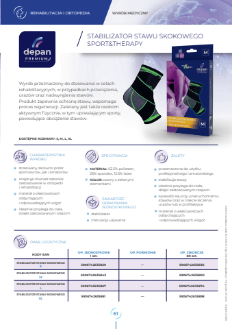 REHABILITACJA I ORTOPEDIA WYR%u00d3B MEDYCZNY590674263583659067426358505906742635874HELBO sp. z o.o. ul. Tadeusza %u015aliwiaka 14A 30-797 Krak%u00f3w KODY EAN 1 szt.STABILIZATOR STAWU SKOKOWEGO 5906742635829STABILIZATOR STAWU SKOKOWEGOM 5906742635843STABILIZATOR STAWU SKOKOWEGO 5906742635867 OP. JEDNOSTKOWE OP. ZBIORCZE80 szt.SL%u2015%u20155906742635898 STABILIZATOR STAWU SKOKOWEGOXL 5906742635881 %u2015%u2015DANE LOGISTYCZNEDane oraz zdj%u0119cia zawarte w karcie maj%u0105 charakter pogl%u0105dowy i mog%u0105 ulec zmianie. Wyd. 02/ 2025 OP. PO%u015aREDNIESTABILIZATOR STAWU SKOKOWEGOSPORT&THERAPYCHARAKTERYSTYKA SPECYFIKACJA ZALETYWYROBUZAWARTO%u015a%u0106OPAKOWANIAJEDNOSTKOWEGODOST%u0118PNE ROZMIARY: S, M, L, XLprzeznaczona do u%u017cytku profesjonalnego i amatorskiegostabilizuje stawyidealnie przylega do cia%u0142a, dzi%u0119ki zastosowanym rzepomsprawdzi si%u0119 przy unieruchomieniu staw%u00f3w oraz w trakcie leczenia uraz%u00f3w lub w profilaktycemateria%u0142 o w%u0142a%u015bciwo%u015bciach oddychaj%u0105cych i odprowadzaj%u0105cych wilgo%u0107MATERIA%u0141: 62.5% poliester, 25% spandex, 12.5% latexKOLOR: czarny z zielonymi elementamistosowany zar%u00f3wno przez sportowc%u00f3w, jak i amator%u00f3wznajduje r%u00f3wnie%u017c szerokie zastosowanie w ortopedii i rehabilitacjimateria%u0142 o w%u0142a%u015bciwo%u015bciach oddychaj%u0105cych i odprowadzaj%u0105cych wilgo%u0107idealnie przylega do cia%u0142a, dzi%u0119ki zastosowanym rzepom stabilizatorinstrukcja u%u017cywaniaWyr%u00f3b przeznaczony do stosowania w celach rehabilitacyjnych, w przypadkach przeci%u0105%u017cenia, uraz%u00f3w oraz nadwyr%u0119%u017cenia staw%u00f3w. Produkt zapewnia ochron%u0119 stawu, wspomaga proces regeneracji. Zalecany jest tak%u017ce osobom aktywnym fizycznie, w tym uprawiaj%u0105cym sporty,powoduj%u0105ce obci%u0105%u017cenie staw%u00f3w. 61