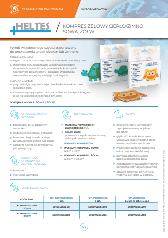 TERAPIA CIEP%u0141EM I ZIMNEM WYR%u00d3B MEDYCZNYDane oraz zdj%u0119cia zawarte w karcie maj%u0105 charakter pogl%u0105dowy i mog%u0105 ulec zmianie. Wyd. 02/ 2025HELBO sp. z o.o. ul. Tadeusza %u015aliwiaka 14A 30-797 Krak%u00f3w CHARAK ZALETY TERYSTYKAWYROBUSPECYFIKACJAZAWARTO%u015a%u0106OPAKOWANIAJEDNOSTKOWEGODANE LOGISTYCZNEkompresinstrukcja u%u017cywaniabezpieczny %u017cel w zgrzanymworeczkuszybko si%u0119 nagrzewa / och%u0142adzakompres d%u0142ugotrwale oddajezakumulowane zimno lub ciep%u0142oMATERIA%u0141 POWIERZCHNIZEWN%u0118TRZNEJ: PVCKOLOR %u017bELU:pomara%u0144czowy (kompres %u2013 sowa),zielony (kompres %u2013 %u017c%u00f3%u0142w)kolorowe wzory kompres%u00f3wzaprojektowane specjalniedla dziecigi%u0119tko%u015b%u0107 i kszta%u0142t kompresuumo%u017cliwia jego wygodne stosowanie na r%u00f3%u017cne cz%u0119%u015bci cia%u0142amo%u017cliwo%u015b%u0107 ogrzania kompresuw kuchence mikrofalowejpomaga odwr%u00f3ci%u0107 uwag%u0119dziecka od o%u015brodka b%u00f3luniezast%u0105piony wsytuacjach,w kt%u00f3rychkonieczna jest nag%u0142a interwencjaidealnie sprawdzi si%u0119 nie tylkow domu, ale tak%u017ce w podr%u00f3%u017cyWYMIARY KOMPRES%u00d3WWYMIARY KOMPRESU SOWA:12 cm x 9 cmWYMIARY KOMPRESU %u017b%u00d3%u0141W:12,5 cm x 8,5 cmSOWA 5906742630411 5906742634099 59067426342975906742633283 5906742634105 5906742634303KODY EAN OP. JEDNOSTKOWE 1 szt. OP. PO%u015aREDNIE6 szt.OP. ZBIORCZE24 szt. (6 szt. x 4 op.)KOMPRES %u017bELOWYKOMPRES %u017bELOWY%u017b%u00d3%u0141WDOST%u0118PNE MODELE: Wyr%u00f3b wielokrotnego u%u017cytku przeznaczonydo prowadzenia terapii ciep%u0142em lub zimnem.TERAPIA ZIMNEM:%u0142agodzi b%u00f3l poprzez miejscowe obni%u017cenie temperatury cia%u0142astosowana przy st%u0142uczeniach, uk%u0105szeniach owad%u00f3w,skr%u0119ceniach, opuchliznach, oparzeniach, kontuzjachsportowych, b%u00f3lach g%u0142owy i gor%u0105czce. Wspomagarekonwalescencj%u0119 po przebytych zabiegachTERAPIA CIEP%u0141EM:przynosi ulg%u0119 poprzez miejscowe dzia%u0142anie rozkurczowe(ogrzanie cia%u0142a)stosowana przy przykurczach, uszkodzeniach mi%u0119%u015bni, %u015bci%u0119gien(o ile nie jest zalecona terapia zimnem)SOWA / %u017b%u00d3%u0141WSOWA, %u017b%u00d3%u0141WKOMPRES %u017bELOWY CIEP%u0141O/ZIMNOkompres nawet po zamro%u017ceniujest plastyczny63