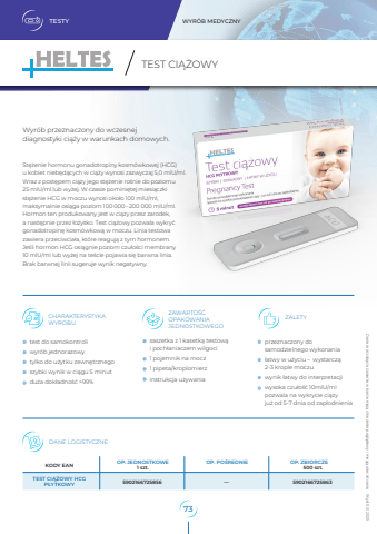 TESTY WYR%u00d3B MEDYCZNY HELBO sp. z o.o. ul. Tadeusza %u015aliwiaka 14A 30-797 Krak%u00f3w CHARAK ZALETY TERYSTYKAWYROBUZAWARTO%u015a%u0106 OPAKOWANIAJEDNOSTKOWEGODANE LOGISTYCZNEsaszetka z 1 kasetk%u0105 testow%u0105 i poch%u0142aniaczem wilgoci1 pojemnik na mocz1 pipeta/kroplomierzinstrukcja u%u017cywaniaprzeznaczony do samodzielnego wykonania%u0142atwy w u%u017cyciu %u2013 wystarcz%u01052-3 krople moczuwynik %u0142atwy do interpretacjiwysoka czu%u0142o%u015b%u0107 10mlU/ml pozwala na wykrycie ci%u0105%u017cy ju%u017c od 5-7 dnia od zap%u0142odnieniaP%u0141YTKOWY 5902166725856 %u2015 5902166725863 KODY EAN OP. JEDNOSTKOWE 1 szt. 500 szt.Wyr%u00f3b przeznaczony do wczesnej diagnostyki ci%u0105%u017cy w warunkach domowych. St%u0119%u017cenie hormonu gonadotropiny kosm%u00f3wkowej (HCG) u kobiet nieb%u0119d%u0105cych w ci%u0105%u017cy wynosi zazwyczaj 5,0 mlU/ml. Wraz z post%u0119pem ci%u0105%u017cy jego st%u0119%u017cenie ro%u015bnie do poziomu 25 mlU/ml lub wy%u017cej. W czasie pomini%u0119tej miesi%u0105czki st%u0119%u017cenie HCG w moczu wynosi oko%u0142o 100 mlU/ml, maksymalnie osi%u0105ga poziom 100 000%u2013200 000 mlU/ml. Hormon ten produkowany jest w ci%u0105%u017cy przez zarodek, a nast%u0119pnie przez %u0142o%u017cysko. Test ci%u0105%u017cowy pozwala wykry%u0107 gonadotropin%u0119 kosm%u00f3wkow%u0105 w moczu. Linia testowa zawiera przeciwcia%u0142a, kt%u00f3re reaguj%u0105 z tym hormonem. Je%u015bli hormon HCG osi%u0105gnie poziom czu%u0142o%u015bci membrany 10 mlU/ml lub wy%u017cej na te%u015bcie pojawia si%u0119 barwna linia. Brak barwnej linii sugeruje wynik negatywny.TEST CI%u0104%u017bOWYtest do samokontroliwyr%u00f3b jednorazowytylko do u%u017cytku zewn%u0119trznegoszybki wynik w ci%u0105gu 5 minutdu%u017ca dok%u0142adno%u015b%u0107 >99%OP. ZBIORCZETEST CI%u0104%u017bOWY HCG OP. PO%u015aREDNIEDane oraz zdj%u0119cia zawarte w karcie maj%u0105 charakter pogl%u0105dowy i mog%u0105 ulec zmianie. Wyd. 02/ 202573