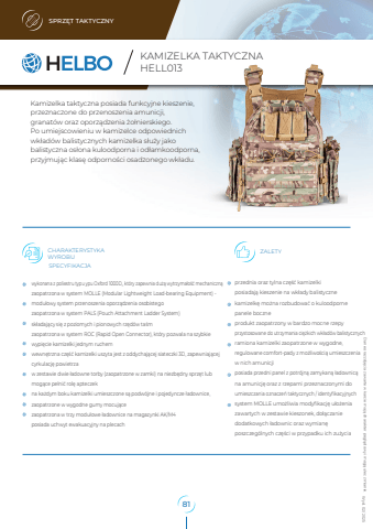 SPRZ%u0118T TAKTYCZNYwykonana z poliestru typu ypu Oxford 1000D,, kt%u00f3ry zapewnia du%u017c%u0105 wytrzyma%u0142o%u015b%u0107 mechaniczn%u0105zaopatrzona w system MOLLE (Modular Lightweight Load-bearing Equipment) - modu%u0142owy system przenoszenia oporz%u0105dzenia osobistegozaopatrzona w system PALS (Pouch Attachment Ladder System)sk%u0142adaj%u0105cy si%u0119 z poziomych i pionowych rz%u0119d%u00f3w ta%u015bmzaopatrzona w system ROC (Rapid Open Connector), kt%u00f3ry pozwala na szybkie wypi%u0119cie kamizelki jednym ruchemwewn%u0119trzna cz%u0119%u015b%u0107 kamizelki uszyta jest z oddychaj%u0105cej siateczki 3D, zapewniaj%u0105cej cyrkulacj%u0119 powietrzaw zestawie dwie %u0142adowne torby (zaopatrzone w zamki) na niezb%u0119dny sprz%u0119t lub mog%u0105ce pe%u0142ni%u0107 rol%u0119 apteczekna ka%u017cdym boku kamizelki umieszczone s%u0105 podw%u00f3jne i pojedyncze %u0142adownice, zaopatrzone w wygodne gumy mocuj%u0105cezaopatrzona w trzy modu%u0142owe %u0142adownice na magazynki AK/M4posiada uchwyt ewakuacyjny na plecachCHARAKTERYSTYKA ZALETYWYROBUSPECYFIKACJAHELBO sp. z o.o. ul. Tadeusza %u015aliwiaka 14A 30-797 Krak%u00f3w www.helbo.plKamizelka taktyczna posiada funkcyjne kieszenie, przeznaczone do przenoszenia amunicji, granat%u00f3w oraz oporz%u0105dzenia %u017co%u0142nierskiego. Po umiejscowieniu w kamizelce odpowiednich wk%u0142ad%u00f3w balistycznych kamizelka s%u0142u%u017cy jako balistyczna os%u0142ona kuloodporna i od%u0142amkoodporna, przyjmuj%u0105c klas%u0119 odporno%u015bci osadzonego wk%u0142adu. Dane oraz zdj%u0119cia zawarte w karcie maj%u0105 charakter pogl%u0105dowy i mog%u0105 ulec zmianie. Wyd. 02/ 2025KAMIZELKA TAKTYCZNAHELL013przednia oraz tylna cz%u0119%u015b%u0107 kamizelki posiadaj%u0105 kieszenie na wk%u0142ady balistycznekamizelk%u0119 mo%u017cna rozbudowa%u0107 o kuloodporne panele boczneprodukt zaopatrzony w bardzo mocne rzepy przystosowane do utrzymania ci%u0119%u017ckich wk%u0142ad%u00f3w balistycznychramiona kamizelki zaopatrzone w wygodne, regulowane comfort-pady z mo%u017cliwo%u015bci%u0105 umieszczeniaw nich amunicjiposiada przedni panel z potr%u00f3jn%u0105 zamykan%u0105 %u0142adownic%u0105na amunicj%u0119 oraz z rzepami przeznaczonymi do umieszczania oznacze%u0144 taktycznych / identyfikacyjnychsystem MOLLE umo%u017cliwia modyfikacj%u0119 u%u0142o%u017cenia zawartych w zestawie kieszonek, do%u0142%u0105czanie dodatkowych %u0142adownic oraz wymian%u0119 poszczeg%u00f3lnych cz%u0119%u015bci w przypadku ich zu%u017cycia81