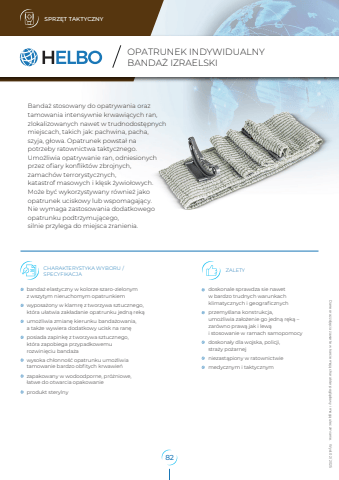 SPRZ%u0118T TAKTYCZNYHELBO sp. z o.o. ul. Tadeusza %u015aliwiaka 14A 30-797 Krak%u00f3w Dane oraz zdj%u0119cia zawarte w karcie maj%u0105 charakter pogl%u0105dowy i mog%u0105 ulec zmianie. Wyd. 02/ 2025OPATRUNEK INDYWIDUALNY BANDA%u017b IZRAELSKIbanda%u017c elastyczny w kolorze szaro-zielonym z wszytym nieruchomym opatrunkiemwyposa%u017cony w klamr%u0119 z tworzywa sztucznego,kt%u00f3ra u%u0142atwia zak%u0142adanie opatrunku jedn%u0105 rek%u0105umo%u017cliwia zmian%u0119 kierunku banda%u017cowania,a tak%u017ce wywiera dodatkowy ucisk na ran%u0119posiada zapink%u0119 z tworzywa sztucznego,kt%u00f3ra zapobiega przypadkowemu rozwini%u0119ciu banda%u017cawysoka ch%u0142onno%u015b%u0107 opatrunku umo%u017cliwia tamowanie bardzo obfitych krwawie%u0144zapakowany w wodoodporne, pr%u00f3%u017cniowe,%u0142atwe do otwarcia opakowanieprodukt sterylnyCHARAK ZALETY TERYSTYKA WYBORU /SPECYFIKACJAdoskonale sprawdza sie nawetw bardzo trudnych warunkachklimatycznych i geograficznychprzemy%u015blana konstrukcja,umo%u017cliwia za%u0142o%u017cenie go jedn%u0105 r%u0119k%u0105 %u2013 zar%u00f3wno praw%u0105 jak i lew%u0105i stosowanie w ramach samopomocydoskona%u0142y dla wojska, policji,stra%u017cy po%u017carnejniezast%u0105piony w ratownictwiemedycznym i taktycznymBanda%u017c stosowany do opatrywania oraz tamowania intensywnie krwawi%u0105cych ran, zlokalizowanych nawet w trudnodost%u0119pnych miejscach, takich jak: pachwina, pacha, szyja, g%u0142owa. Opatrunek powsta%u0142 na potrzeby ratownictwa taktycznego. Umo%u017cliwia opatrywanie ran, odniesionych przez ofiary konflikt%u00f3w zbrojnych, zamach%u00f3w terrorystycznych, katastrof masowych i kl%u0119sk %u017cywio%u0142owych. Mo%u017ce by%u0107 wykorzystywany r%u00f3wnie%u017c jako opatrunek uciskowy lub wspomagaj%u0105cy. Nie wymaga zastosowania dodatkowego opatrunku podtrzymuj%u0105cego, silnie przylega do miejsca zranienia.82