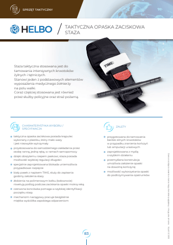 SPRZ%u0118T TAKTYCZNYtaktyczna opaska zaciskowa posiada kr%u0119pulec wykonany z plastiku, kt%u00f3ry ma%u0142o wa%u017cy i jest niezwykle wytrzyma%u0142yprzystosowana do samodzielnego zak%u0142adania przez osob%u0119 rann%u0105, jedn%u0105 r%u0119k%u0105, w ramach samopomocydzi%u0119ki obszytemu rzepem paskowi, staza posiada mo%u017cliwo%u015b%u0107 szybkiej regulacji d%u0142ugo%u015bcispecjalnie zaprojektowana blokada uniemo%u017cliwia przypadkowe rozpi%u0119cie bia%u0142y pasek z napisem TIME, s%u0142u%u017cy do zapisania godziny za%u0142o%u017cenia stazy%u017c%u0142obienia na polimerowym ko%u0142ku (ko%u0142owrocie) niweluj%u0105 po%u015blizg podczas zaciskania opaski mokr%u0105 rek%u0105czerwona konc%u00f3wka pomaga w szybkiej identyfikacji pocz%u0105tku stazymechanizm naci%u0105gowy pracuje bezg%u0142o%u015bniemi%u0119kka wy%u015bci%u00f3%u0142ka zapobiega odparzeniom CHARAK ZALETY TERYSTYKA WYBORU /SPECYFIKACJAHELBO sp. z o.o. ul. Tadeusza %u015aliwiaka 14A 30-797 Krak%u00f3w www.helbo.plDane oraz zdj%u0119cia zawarte w karcie maj%u0105 charakter pogl%u0105dowy i mog%u0105 ulec zmianie. Wyd. 02/ 2025TAKTYCZNA OPASKA ZACISKOWASTAZA przygotowana do tamowania bardzo silnych krwotok%u00f3w w przypadku zranienia ko%u0144czy%u0144 lub amputacji urazowychzaprojektowana z my%u015bl%u0105 o szybkim dzia%u0142aniuprzemy%u015blana konstrukcjaumo%u017cliwia za%u0142o%u017cenie opaskina dowoln%u0105 ko%u0144czyn%u0119mo%u017cliwo%u015b%u0107 wykorzystania opaskido podtrzymywania opatrunk%u00f3wStaza taktyczna stosowana jest do tamowania intensywnych krwotok%u00f3w %u017cylnych i t%u0119tniczych. Stanowi jeden z podstawowych element%u00f3w wyposa%u017cenia medycznego %u017co%u0142nierzy na polu walki.Coraz cz%u0119%u015bciej stosowana jest r%u00f3wnie%u017c przez s%u0142u%u017cby policyjne oraz stra%u017c po%u017carn%u0105.83