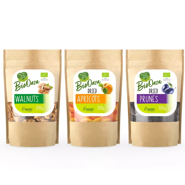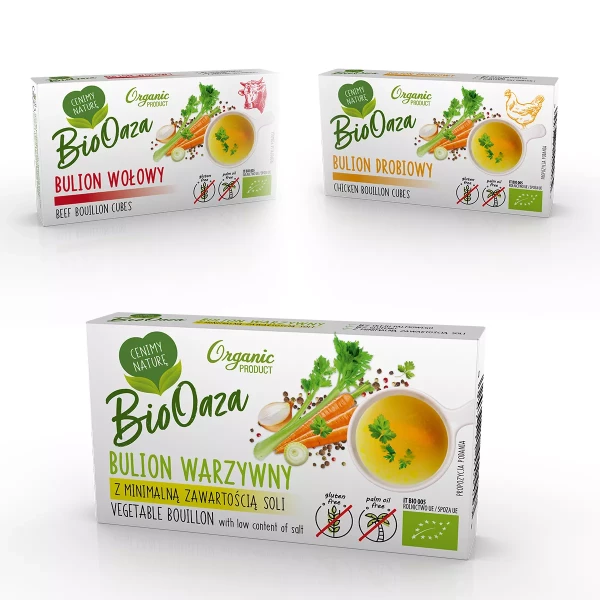 Visualizations of BioOaza brand products for POS materials, including: catalogues, press advertisements, leaflets, website advertisements.