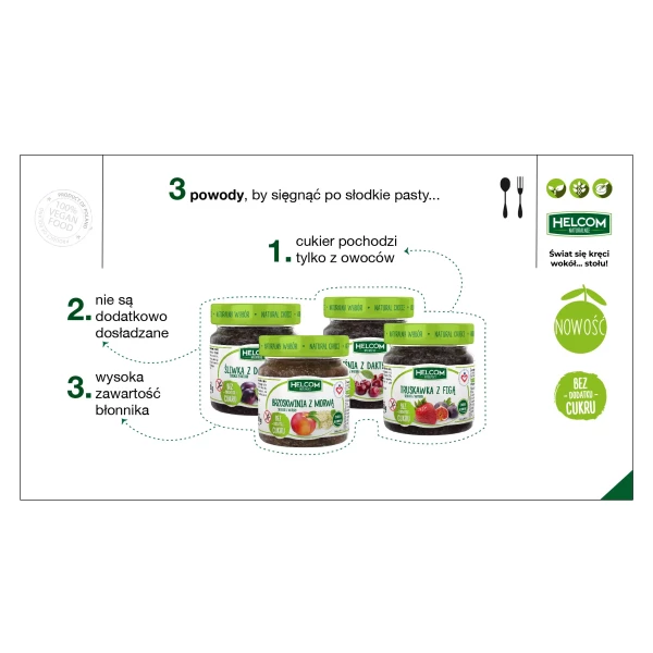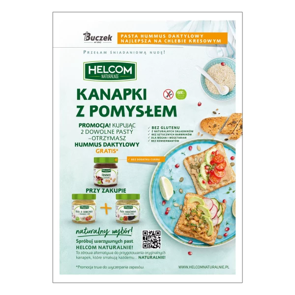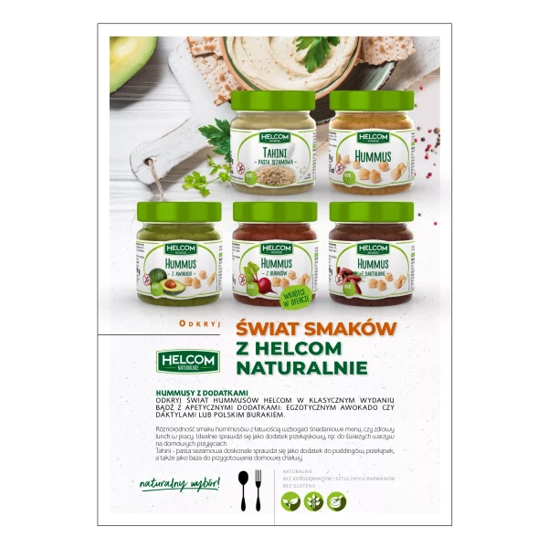 Marka Helcom Naturalnie to linia produktów spożywczych opartych na naturalnych składnikach, bez zbędnych dodatków i konserwantów. W ofercie znajdują się m.in. przetwory owocowe, przeciery, hummusy i pasty warzywne, stworzone z myślą o świadomych konsumentach poszukujących smaku bliskiego naturze.